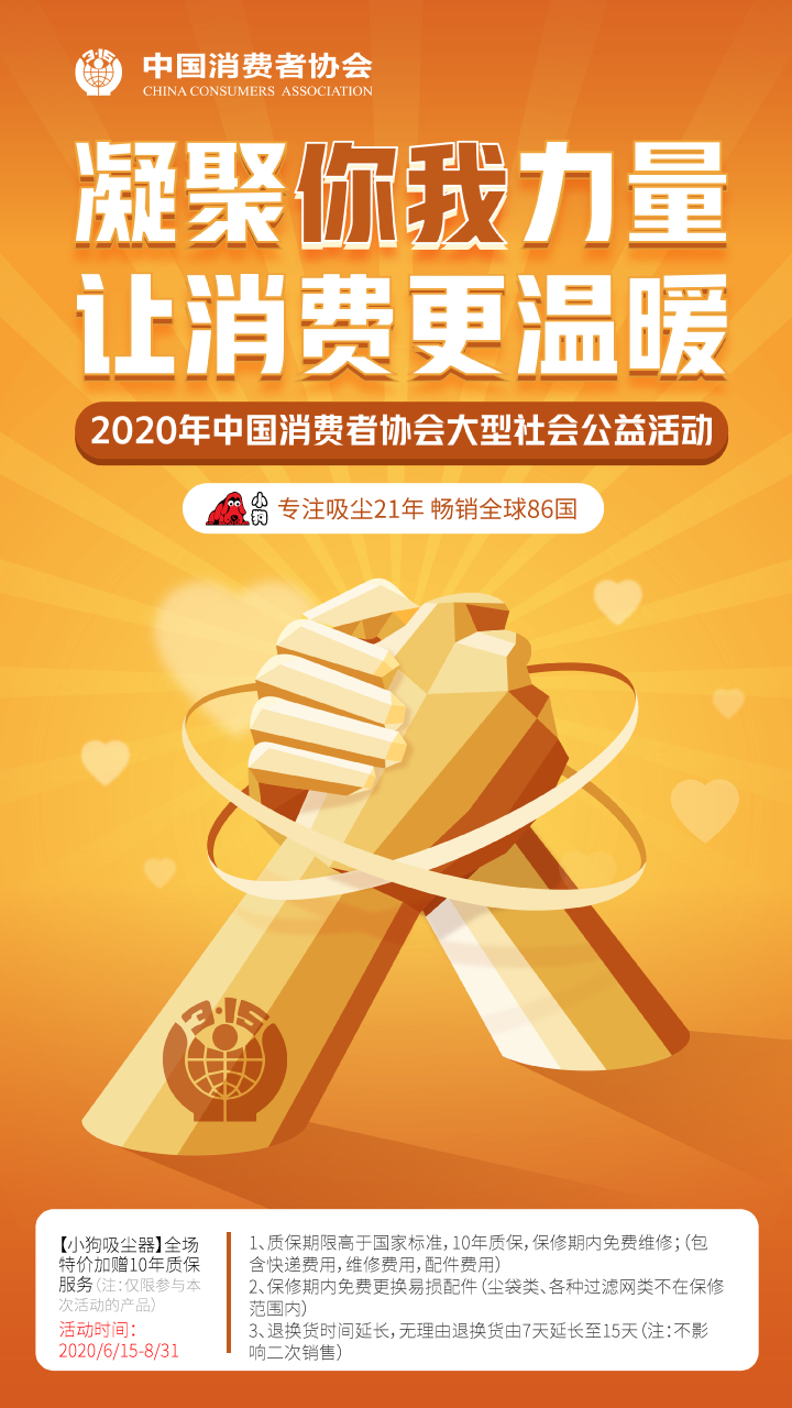 小狗吸塵器響應(yīng)中國消費(fèi)者協(xié)會倡議,積極參與“凝聚你我力量 讓消費(fèi)更溫暖”活動。推出“中國的小狗,讓消費(fèi)更溫暖”活動,小狗吸塵器承諾此次活動購買的用戶質(zhì)保期限高于國家標(biāo)準(zhǔn),10年質(zhì)保,免費(fèi)維修。