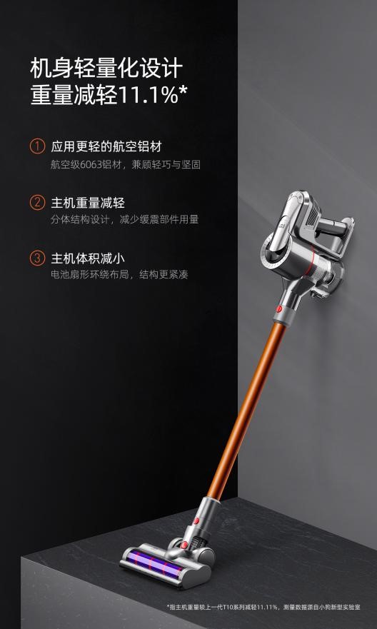 在家庭清潔中,難免會(huì)遇到長(zhǎng)時(shí)間的握、舉、提等操作,這時(shí)一款機(jī)身輕盈的吸塵器帶來(lái)的舒適感,尤其對(duì)女性用戶十分友好。為了解決用戶這一痛點(diǎn),小狗無(wú)線吸塵器T11 Pro在機(jī)身上部分采用了密度小強(qiáng)度高的輕質(zhì)航空級(jí)6063鋁材,極大程度降低機(jī)身重量的同時(shí)又提高了堅(jiān)固度。此外,機(jī)身內(nèi)部結(jié)構(gòu)也進(jìn)行了升級(jí)設(shè)計(jì),采用可減少緩震部件用量的分體式結(jié)構(gòu),并搭配緊湊型的電池扇形環(huán)繞布局,進(jìn)一步達(dá)到減小機(jī)身體積的目的。通過(guò)多方面減負(fù),機(jī)器主機(jī)凈重控制在1.48kg,較上一代產(chǎn)品減重11.1%,比戴森V8 slim還輕。能夠減輕清潔負(fù)擔(dān),還能減少腰酸背痛、手腕酸脹等不適。
