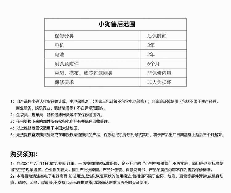 二、退換貨政策 自商品簽收之日起,7天內(nèi)無(wú)理由退換貨。 三、規(guī)則及運(yùn)費(fèi)說(shuō)明 1、無(wú)理由退換貨,請(qǐng)務(wù)必在商品簽收7日內(nèi)辦理,超過(guò)時(shí)限將不予辦理,退換貨郵費(fèi)需買(mǎi)家自行承擔(dān)。 (注:退換貨之前,請(qǐng)您保證商品的完好無(wú)損。損壞、缺件,將無(wú)法為您進(jìn)行退換貨辦理。) 2、商品簽收后如發(fā)現(xiàn)缺件、質(zhì)量有問(wèn)題,馬上聯(lián)系客服發(fā)起退換貨,商品質(zhì)量問(wèn)題引起的退換貨,郵費(fèi)由賣(mài)家承擔(dān)。 (注:簽收后7內(nèi)發(fā)起退換貨,超過(guò)時(shí)限將不予辦理) 溫馨提示:簽收后請(qǐng)您第一時(shí)間核對(duì)配件,試用機(jī)器。 退換貨地址:邢臺(tái)市小狗吸塵器倉(cāng)庫(kù)(詳情請(qǐng)聯(lián)系客服:4001015288 服務(wù)時(shí)間:9:00至20:00 周一至周日) |
